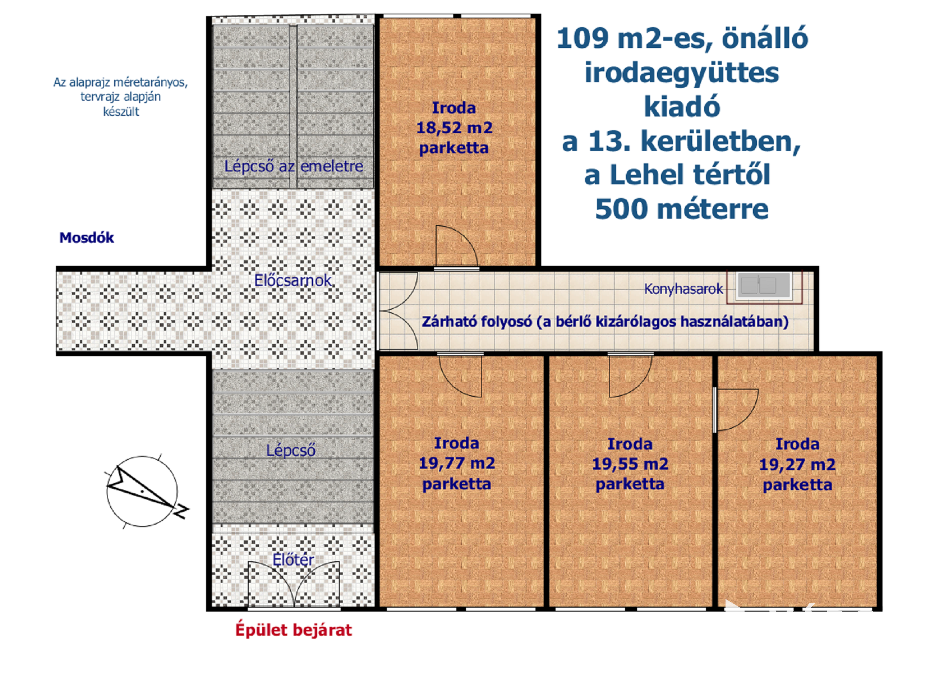 Az önálló folyosón található egy saját, PRAKTIKUS KONYHASAROK, mosdóhasználatra szintén az irodaegyüttes szintjén van lehetőség.