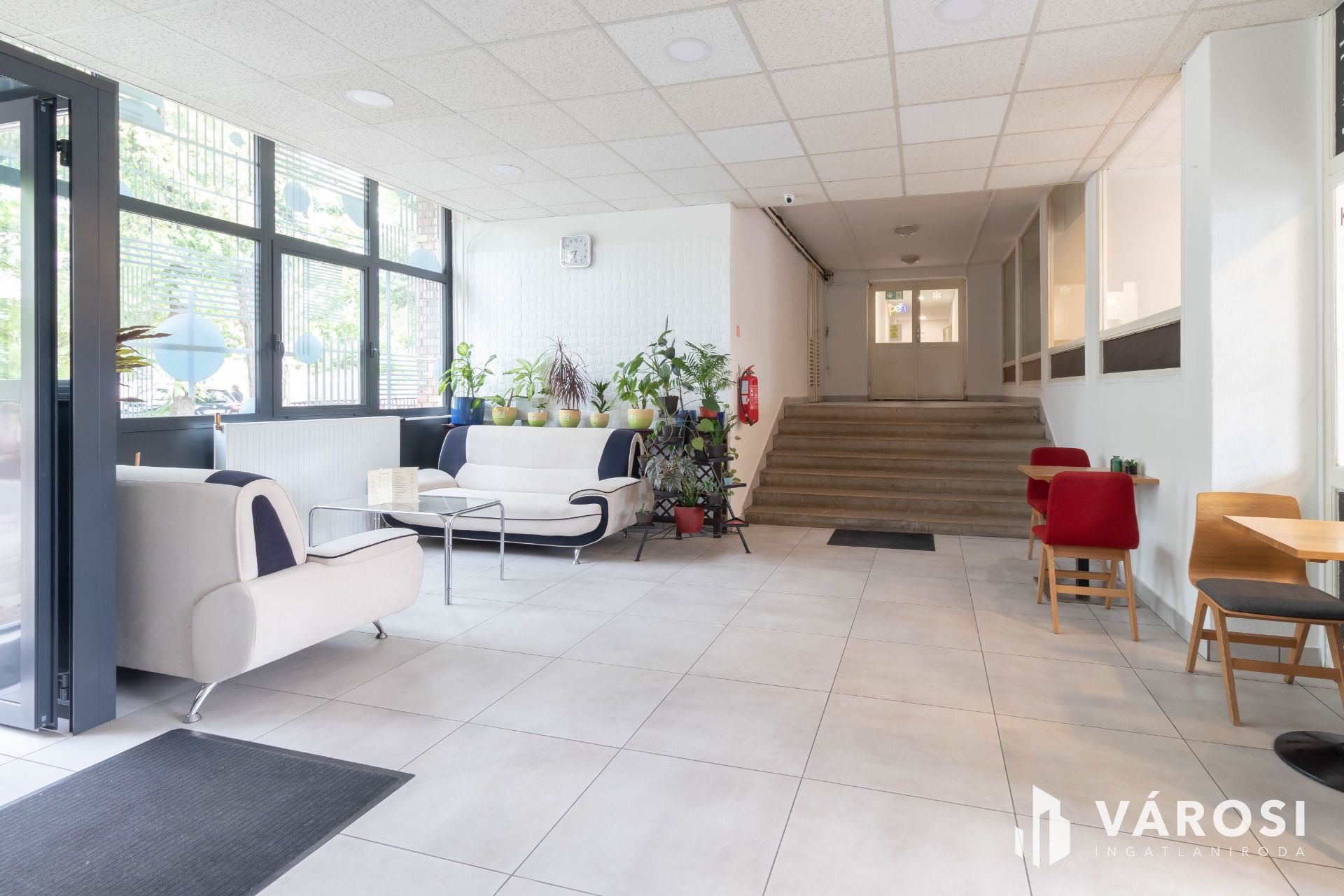 A professzionális környezethez hozzájárul a földszinti recepció, a kényelmes, váróként is funkcionáló előcsarnok, valamint az innen nyíló büfé.