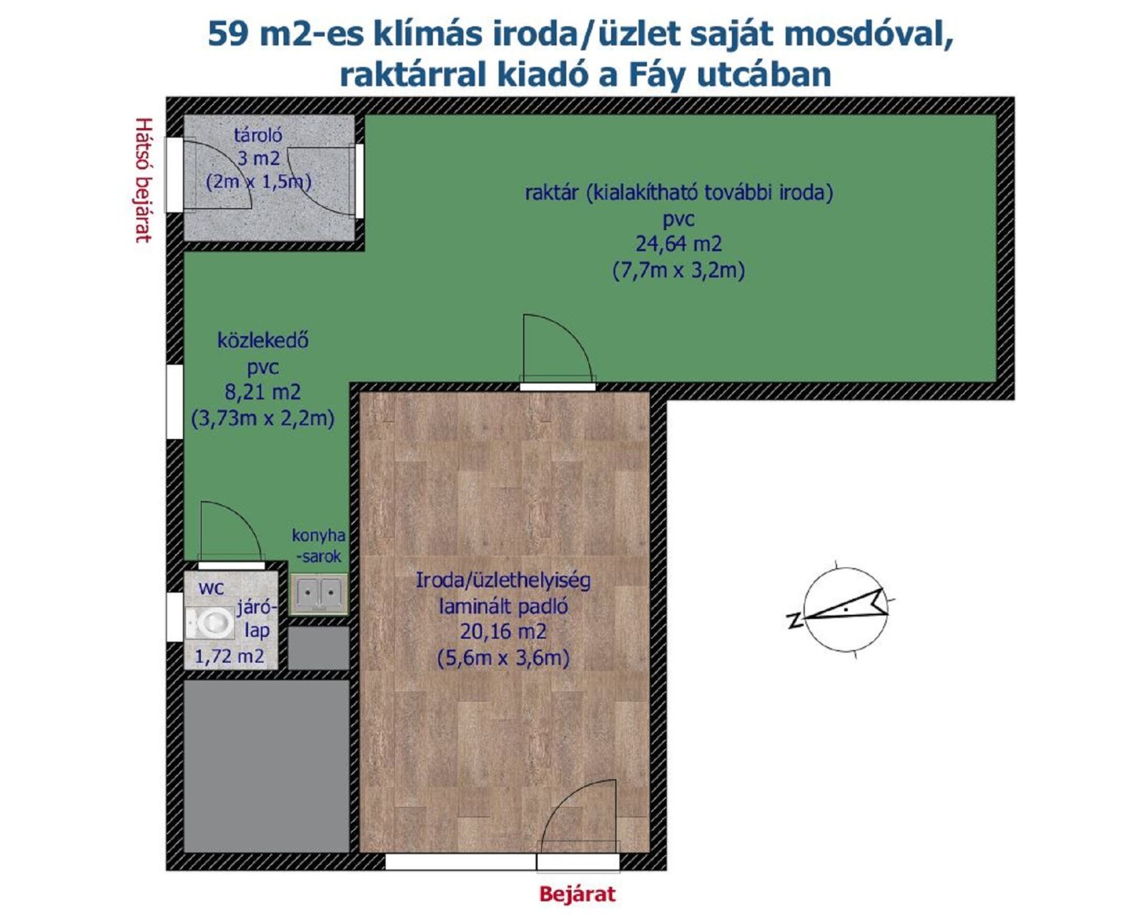 59 m2-es, klímás iroda saját raktárral és mosdóval kiadó