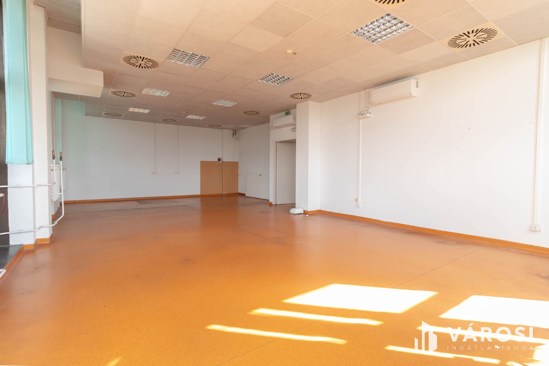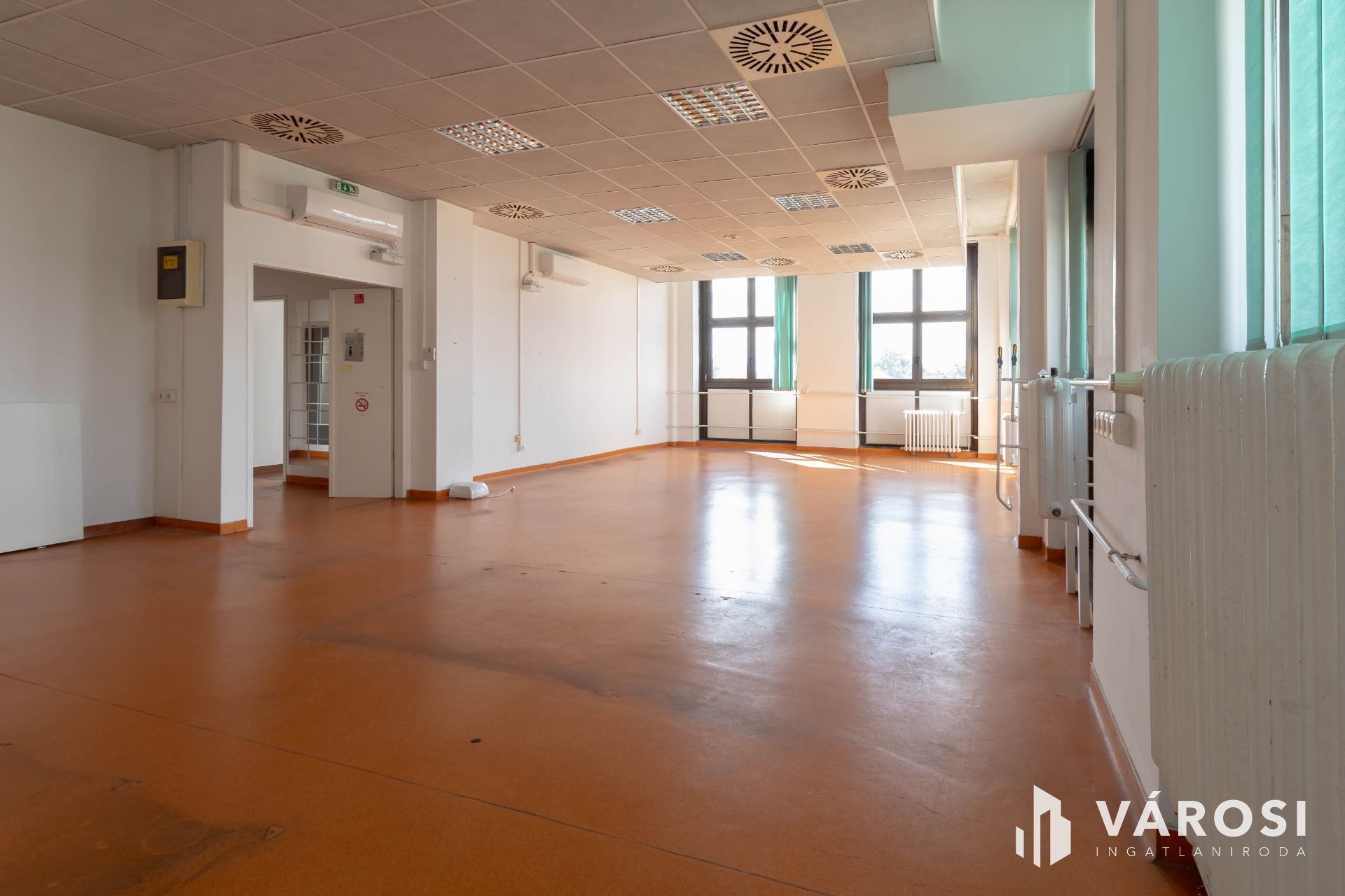 A 2. emeleten található, belső vizesblokkal rendelkező, 132 m2-es ingatlanrészben van egy 77 m2-es nagy terem, valamint két 17 m2-es iroda. A 8 m2-es előtérből nyílik mindegyik, valamint innen nyílik a 7 m2-es konyha is. A konyhából pedig az 5 m2-es mosdó, külön férfi és női wc-vel.