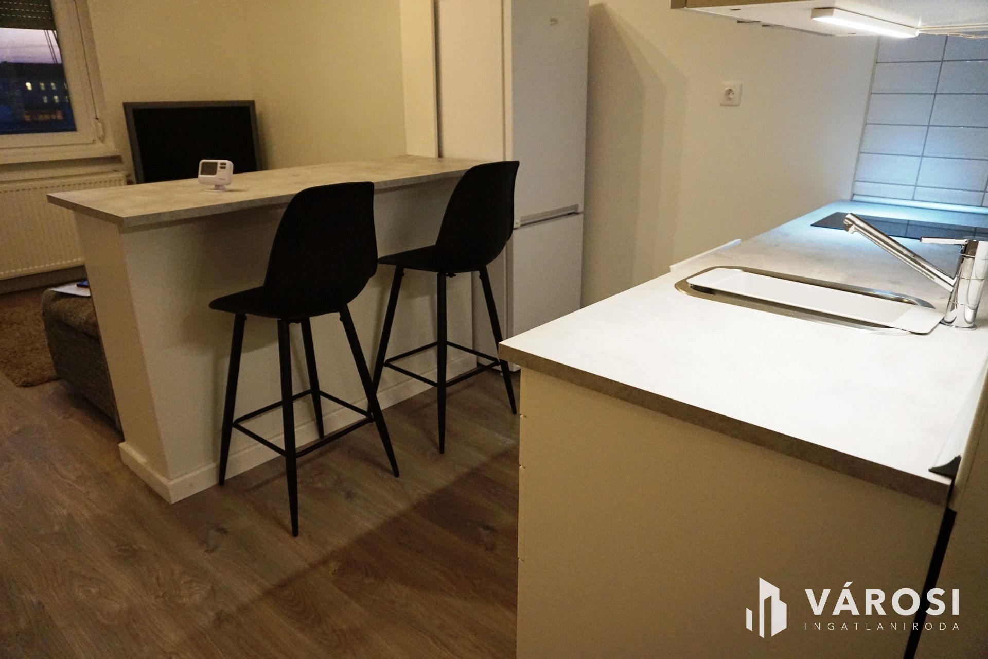 A homogén színeknek köszönhetően valóban tágassá vált a nappali + konyha, melyet egy étkezőpult választ el. A nappaliban elhelyezett kanapé kihúzható. A konyha teljesen felszerelt (hűtőgép, mosogatógép, pára elszívó, sütő).