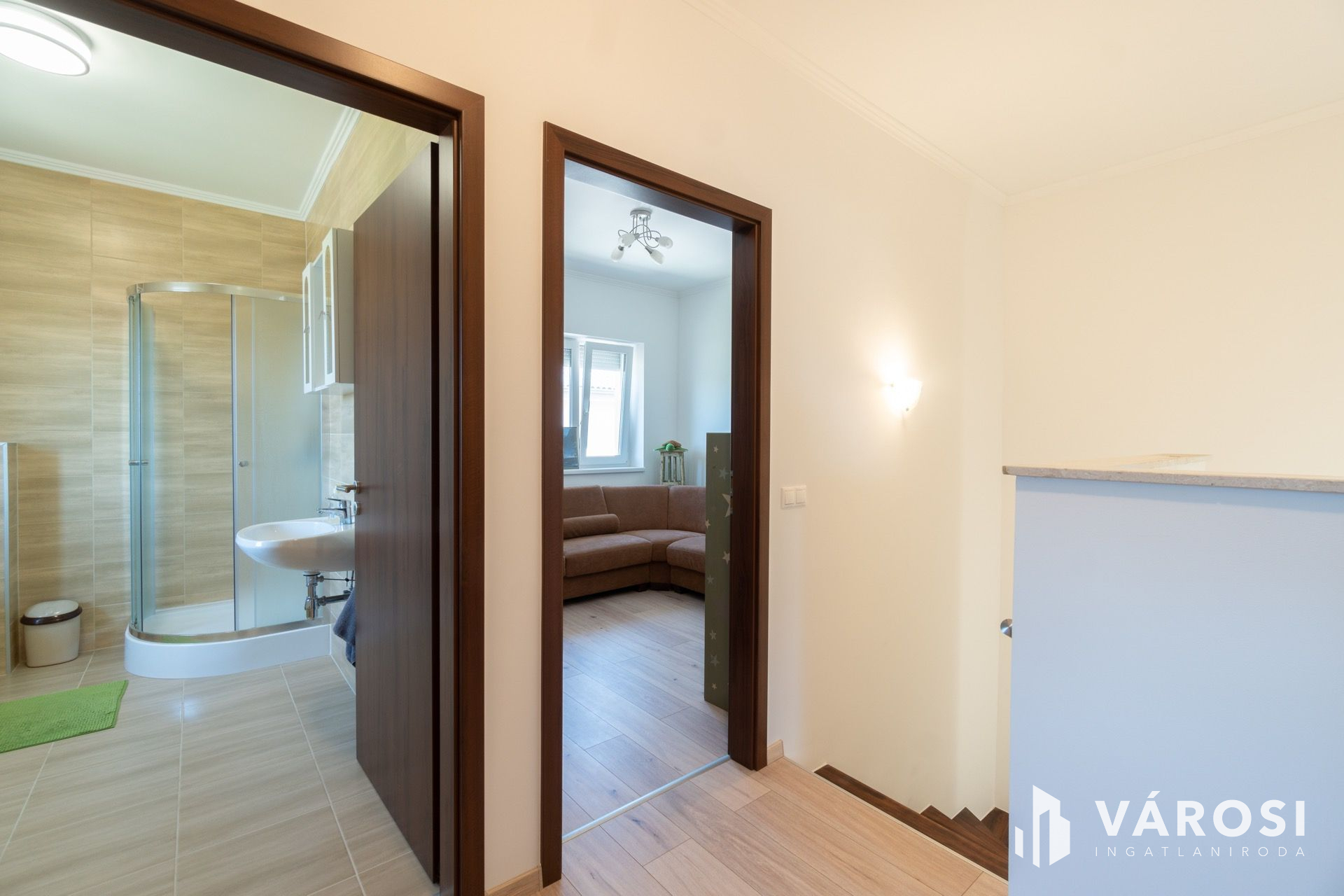 A nettó 84 m²-es két szintes épület földszintjén található az amerikai konyhás nappali (19 m² teraszkapcsolattal), egy hálószoba, amelyből egy kádas fürdőszoba nyílik és egy önálló mellékhelyiség. Az emeleten további két hálószoba (a nagyobbik erkélyes - 4 m²), egy hatalmas zuhanyzós fürdőszoba, egy előtér és a háztartási helyiség helyezkedik el.
